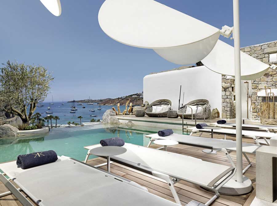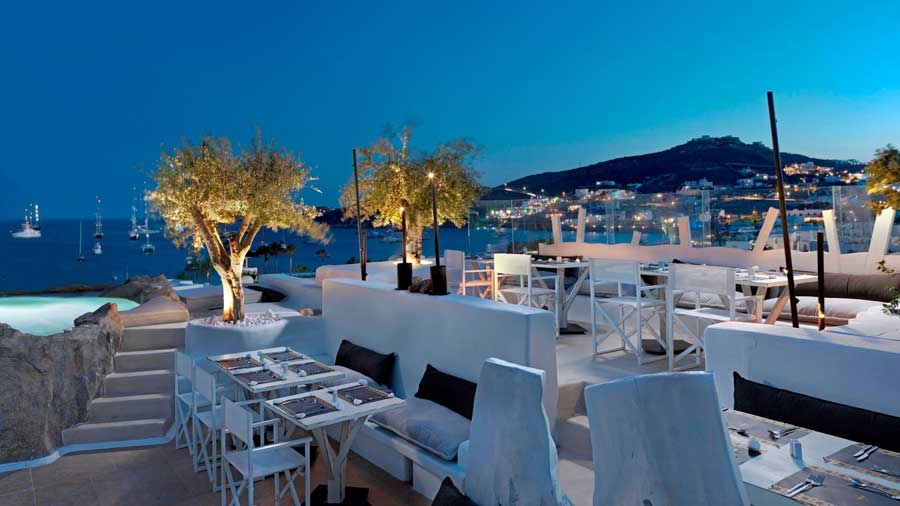 A localização do hotel, no topo de uma íngreme colina acima da praia de Ornos, oferece vistas panorâmicas sobre duas enseadas. Bares de praia, restaurantes e um supermercado estão a três minutos de uma caminhada em declive, enquanto a cidade de Mykonos e os populares clubes de praia da ilha ficam a 10 minutos de carro.